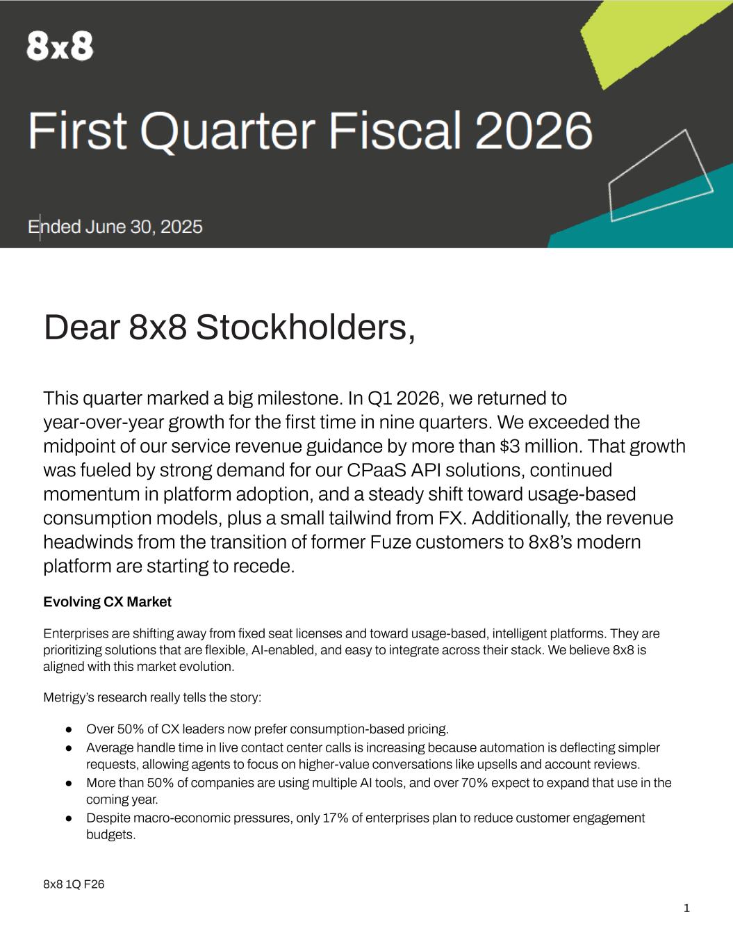 Dear 8x8 Stockholders, This quarter marked a big milestone. In Q1 2026, we returned to year-over-year growth for the first time in nine quarters. We exceeded the midpoint of our service revenue guidance by more than $3 million. That growth was fueled by strong demand for our CPaaS API solutions, continued momentum in platform adoption, and a steady shift toward usage-based consumption models, plus a small tailwind from FX. Additionally, the revenue headwinds from the transition of former Fuze customers to 8x8’s modern platform are starting to recede. Evolving CX Market Enterprises are shifting away from fixed seat licenses and toward usage-based, intelligent platforms. They are prioritizing solutions that are flexible, AI-enabled, and easy to integrate across their stack. We believe 8x8 is aligned with this market evolution. Metrigy’s research really tells the story: ● Over 50% of CX leaders now prefer consumption-based pricing. ● Average handle time in live contact center calls is increasing because automation is deflecting simpler requests, allowing agents to focus on higher-value conversations like upsells and account reviews. ● More than 50% of companies are using multiple AI tools, and over 70% expect to expand that use in the coming year. ● Despite macro-economic pressures, only 17% of enterprises plan to reduce customer engagement budgets. 8x8 1Q F26 1