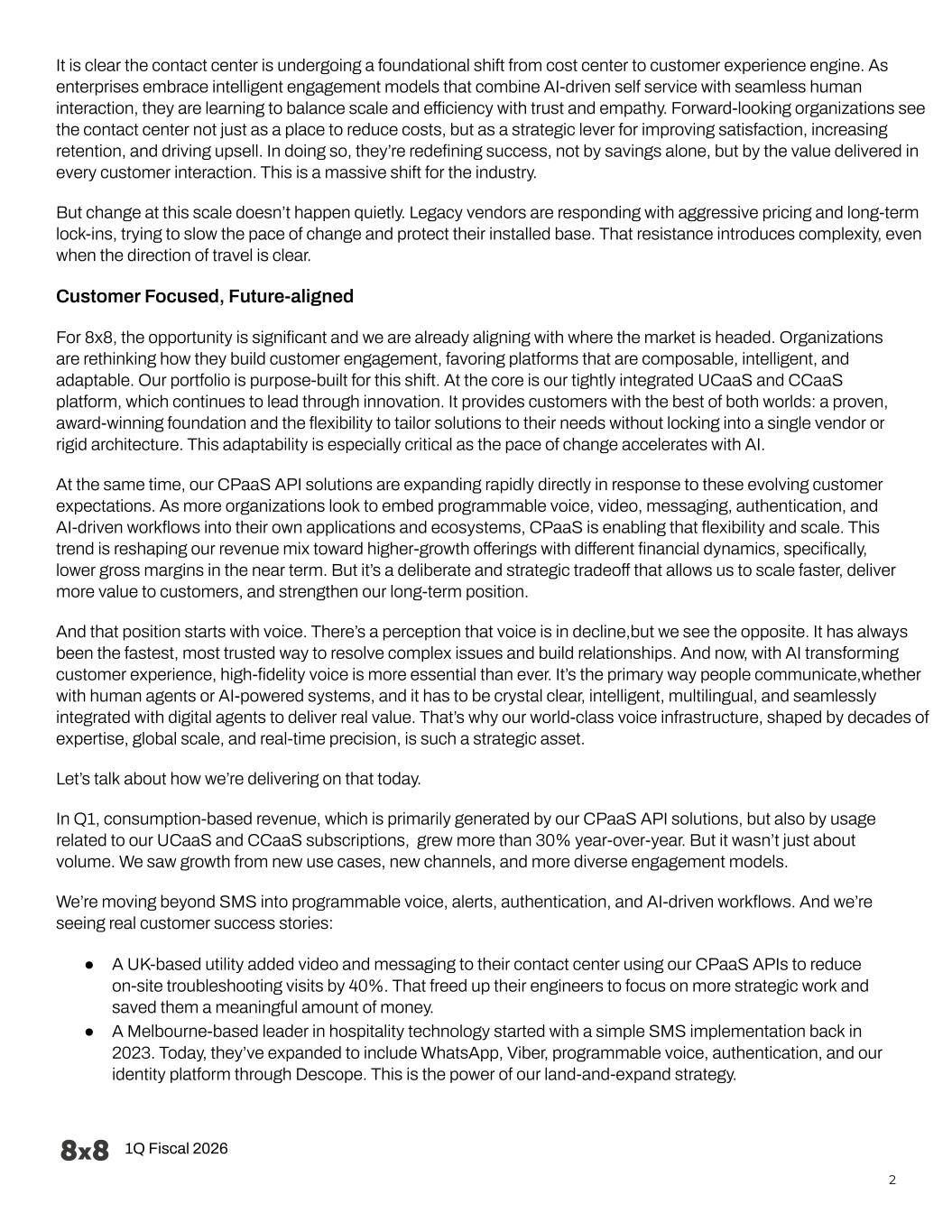 It is clear the contact center is undergoing a foundational shift from cost center to customer experience engine. As enterprises embrace intelligent engagement models that combine AI-driven self service with seamless human interaction, they are learning to balance scale and efficiency with trust and empathy. Forward-looking organizations see the contact center not just as a place to reduce costs, but as a strategic lever for improving satisfaction, increasing retention, and driving upsell. In doing so, they’re redefining success, not by savings alone, but by the value delivered in every customer interaction. This is a massive shift for the industry. But change at this scale doesn’t happen quietly. Legacy vendors are responding with aggressive pricing and long-term lock-ins, trying to slow the pace of change and protect their installed base. That resistance introduces complexity, even when the direction of travel is clear. Customer Focused, Future-aligned For 8x8, the opportunity is significant and we are already aligning with where the market is headed. Organizations are rethinking how they build customer engagement, favoring platforms that are composable, intelligent, and adaptable. Our portfolio is purpose-built for this shift. At the core is our tightly integrated UCaaS and CCaaS platform, which continues to lead through innovation. It provides customers with the best of both worlds: a proven, award-winning foundation and the flexibility to tailor solutions to their needs without locking into a single vendor or rigid architecture. This adaptability is especially critical as the pace of change accelerates with AI. At the same time, our CPaaS API solutions are expanding rapidly directly in response to these evolving customer expectations. As more organizations look to embed programmable voice, video, messaging, authentication, and AI-driven workflows into their own applications and ecosystems, CPaaS is enabling that flexibility and scale. This trend is reshaping our revenue mix toward higher-growth offerings with different financial dynamics, specifically, lower gross margins in the near term. But it’s a deliberate and strategic tradeoff that allows us to scale faster, deliver more value to customers, and strengthen our long-term position. And that position starts with voice. There’s a perception that voice is in decline,but we see the opposite. It has always been the fastest, most trusted way to resolve complex issues and build relationships. And now, with AI transforming customer experience, high-fidelity voice is more essential than ever. It’s the primary way people communicate,whether with human agents or AI-powered systems, and it has to be crystal clear, intelligent, multilingual, and seamlessly integrated with digital agents to deliver real value. That’s why our world-class voice infrastructure, shaped by decades of expertise, global scale, and real-time precision, is such a strategic asset. Let’s talk about how we’re delivering on that today. In Q1, consumption-based revenue, which is primarily generated by our CPaaS API solutions, but also by usage related to our UCaaS and CCaaS subscriptions, grew more than 30% year-over-year. But it wasn’t just about volume. We saw growth from new use cases, new channels, and more diverse engagement models. We’re moving beyond SMS into programmable voice, alerts, authentication, and AI-driven workflows. And we’re seeing real customer success stories: ● A UK-based utility added video and messaging to their contact center using our CPaaS APIs to reduce on-site troubleshooting visits by 40%. That freed up their engineers to focus on more strategic work and saved them a meaningful amount of money. ● A Melbourne-based leader in hospitality technology started with a simple SMS implementation back in 2023. Today, they’ve expanded to include WhatsApp, Viber, programmable voice, authentication, and our identity platform through Descope. This is the power of our land-and-expand strategy. 1Q Fiscal 2026 2