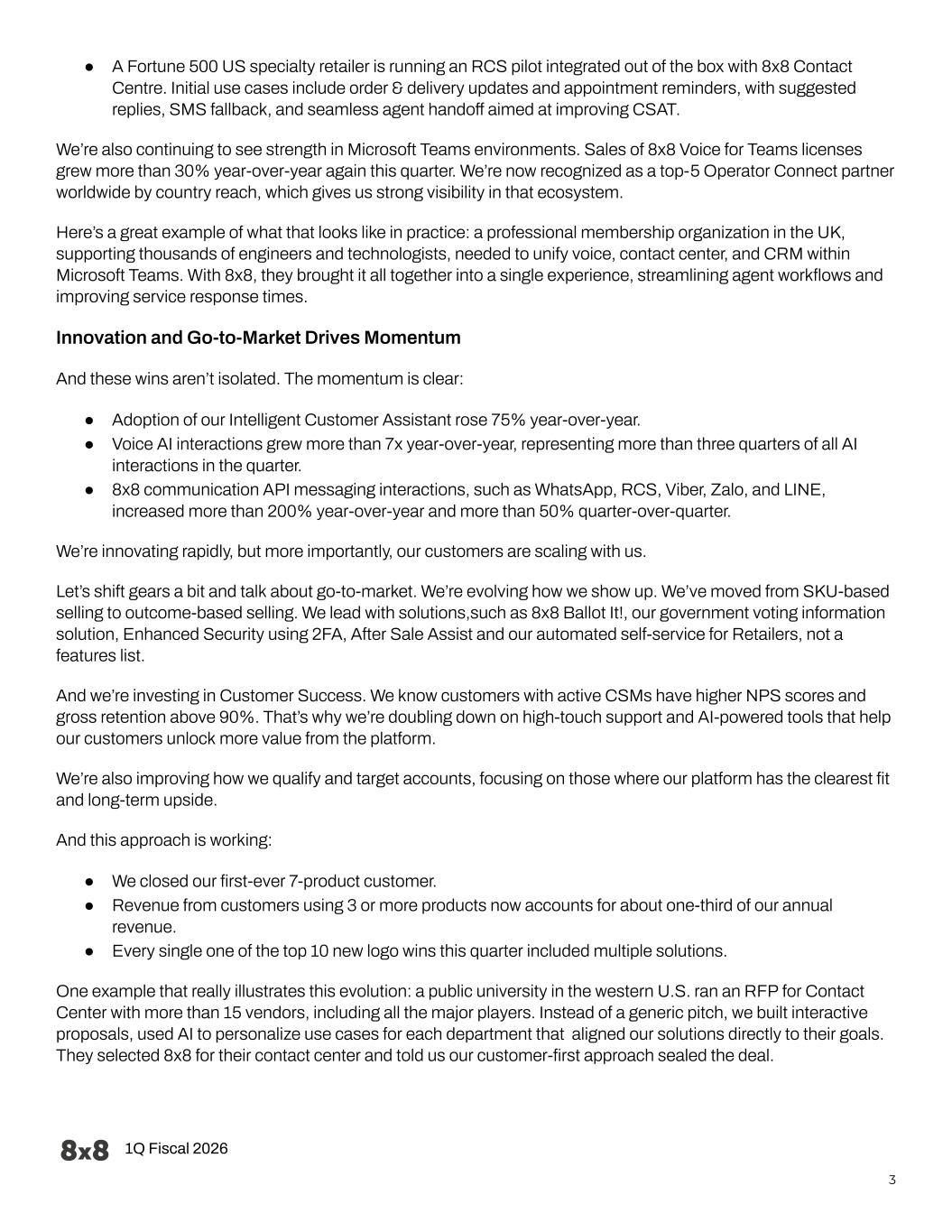 ● A Fortune 500 US specialty retailer is running an RCS pilot integrated out of the box with 8x8 Contact Centre. Initial use cases include order & delivery updates and appointment reminders, with suggested replies, SMS fallback, and seamless agent handoff aimed at improving CSAT. We’re also continuing to see strength in Microsoft Teams environments. Sales of 8x8 Voice for Teams licenses grew more than 30% year-over-year again this quarter. We’re now recognized as a top-5 Operator Connect partner worldwide by country reach, which gives us strong visibility in that ecosystem. Here’s a great example of what that looks like in practice: a professional membership organization in the UK, supporting thousands of engineers and technologists, needed to unify voice, contact center, and CRM within Microsoft Teams. With 8x8, they brought it all together into a single experience, streamlining agent workflows and improving service response times. Innovation and Go-to-Market Drives Momentum And these wins aren’t isolated. The momentum is clear: ● Adoption of our Intelligent Customer Assistant rose 75% year-over-year. ● Voice AI interactions grew more than 7x year-over-year, representing more than three quarters of all AI interactions in the quarter. ● 8x8 communication API messaging interactions, such as WhatsApp, RCS, Viber, Zalo, and LINE, increased more than 200% year-over-year and more than 50% quarter-over-quarter. We’re innovating rapidly, but more importantly, our customers are scaling with us. Let’s shift gears a bit and talk about go-to-market. We’re evolving how we show up. We’ve moved from SKU-based selling to outcome-based selling. We lead with solutions,such as 8x8 Ballot It!, our government voting information solution, Enhanced Security using 2FA, After Sale Assist and our automated self-service for Retailers, not a features list. And we’re investing in Customer Success. We know customers with active CSMs have higher NPS scores and gross retention above 90%. That’s why we’re doubling down on high-touch support and AI-powered tools that help our customers unlock more value from the platform. We’re also improving how we qualify and target accounts, focusing on those where our platform has the clearest fit and long-term upside. And this approach is working: ● We closed our first-ever 7-product customer. ● Revenue from customers using 3 or more products now accounts for about one-third of our annual revenue. ● Every single one of the top 10 new logo wins this quarter included multiple solutions. One example that really illustrates this evolution: a public university in the western U.S. ran an RFP for Contact Center with more than 15 vendors, including all the major players. Instead of a generic pitch, we built interactive proposals, used AI to personalize use cases for each department that aligned our solutions directly to their goals. They selected 8x8 for their contact center and told us our customer-first approach sealed the deal. 1Q Fiscal 2026 3