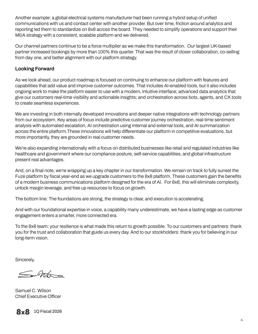 Another example: a global electrical systems manufacturer had been running a hybrid setup of unified communications with us and contact center with another provider. But over time, friction around analytics and reporting led them to standardize on 8x8 across the board. They needed to simplify operations and support their M&A strategy with a consistent, scalable platform and we delivered. Our channel partners continue to be a force multiplier as we make this transformation. Our largest UK-based partner increased bookings by more than 100% this quarter. That was the result of closer collaboration, co-selling from day one, and better alignment with our platform strategy. Looking Forward As we look ahead, our product roadmap is focused on continuing to enhance our platform with features and capabilities that add value and improve customer outcomes. That includes AI-enabled tools, but it also includes ongoing work to make the platform easier to use with a modern, intuitive interface; advanced data analytics that give our customers real-time visibility and actionable insights; and orchestration across bots, agents, and CX tools to create seamless experiences. We are investing in both internally developed innovations and deeper native integrations with technology partners from our ecosystem. Key areas of focus include predictive customer journey orchestration, real-time sentiment analysis with automated escalation, AI orchestration using internal and external tools, and AI summarization across the entire platform.These innovations will help differentiate our platform in competitive evaluations, but more importantly, they are grounded in real customer needs. We’re also expanding internationally with a focus on distributed businesses like retail and regulated industries like healthcare and government where our compliance posture, self-service capabilities, and global infrastructure present real advantages. And, on a final note, we’re wrapping up a key chapter in our transformation. We remain on track to fully sunset the Fuze platform by fiscal year-end as we upgrade customers to the 8x8 platform. These customers gain the benefits of a modern business communications platform designed for the era of AI. For 8x8, this will eliminate complexity, unlock margin leverage, and free up resources to focus on growth. The bottom line: The foundations are strong, the strategy is clear, and execution is accelerating. And with our foundational expertise in voice, a capability many underestimate, we have a lasting edge as customer engagement enters a smarter, more connected era. To the 8x8 team: your resilience is what made this return to growth possible. To our customers and partners: thank you for the trust and collaboration that guide us every day. And to our stockholders: thank you for believing in our long-term vision. Sincerely, Samuel C. Wilson Chief Executive Officer 1Q Fiscal 2026 4