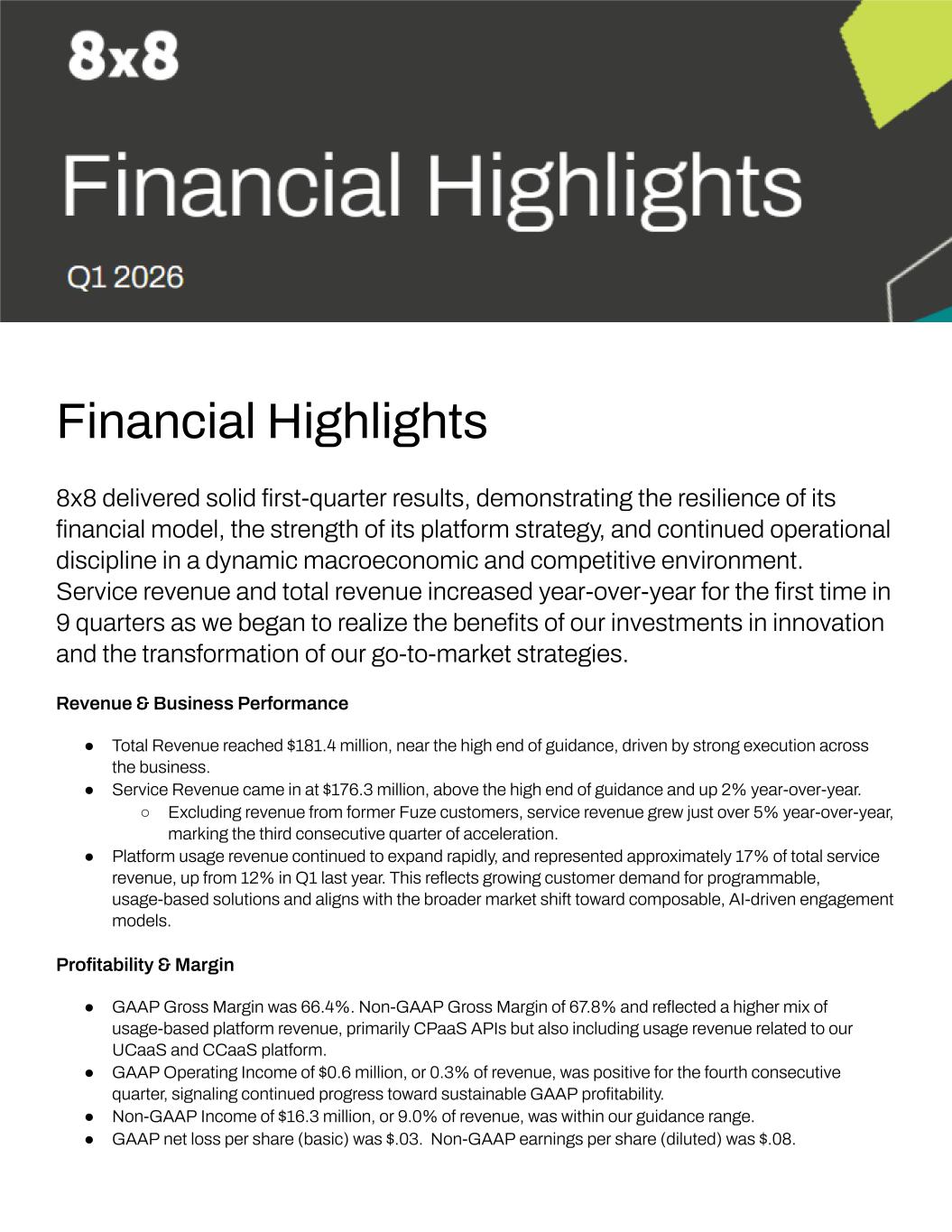 Financial Highlights 8x8 delivered solid first-quarter results, demonstrating the resilience of its financial model, the strength of its platform strategy, and continued operational discipline in a dynamic macroeconomic and competitive environment. Service revenue and total revenue increased year-over-year for the first time in 9 quarters as we began to realize the benefits of our investments in innovation and the transformation of our go-to-market strategies. Revenue & Business Performance ● Total Revenue reached $181.4 million, near the high end of guidance, driven by strong execution across the business. ● Service Revenue came in at $176.3 million, above the high end of guidance and up 2% year-over-year. ○ Excluding revenue from former Fuze customers, service revenue grew just over 5% year-over-year, marking the third consecutive quarter of acceleration. ● Platform usage revenue continued to expand rapidly, and represented approximately 17% of total service revenue, up from 12% in Q1 last year. This reflects growing customer demand for programmable, usage-based solutions and aligns with the broader market shift toward composable, AI-driven engagement models. Profitability & Margin ● GAAP Gross Margin was 66.4%. Non-GAAP Gross Margin of 67.8% and reflected a higher mix of usage-based platform revenue, primarily CPaaS APIs but also including usage revenue related to our UCaaS and CCaaS platform. ● GAAP Operating Income of $0.6 million, or 0.3% of revenue, was positive for the fourth consecutive quarter, signaling continued progress toward sustainable GAAP profitability. ● Non-GAAP Income of $16.3 million, or 9.0% of revenue, was within our guidance range. ● GAAP net loss per share (basic) was $.03. Non-GAAP earnings per share (diluted) was $.08.