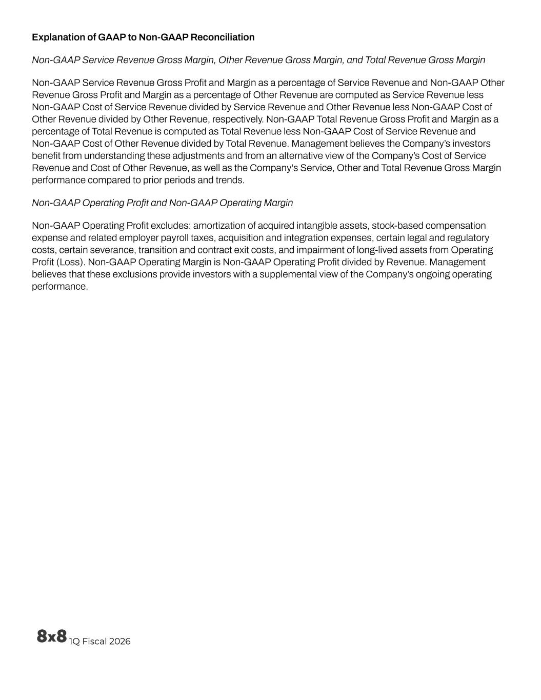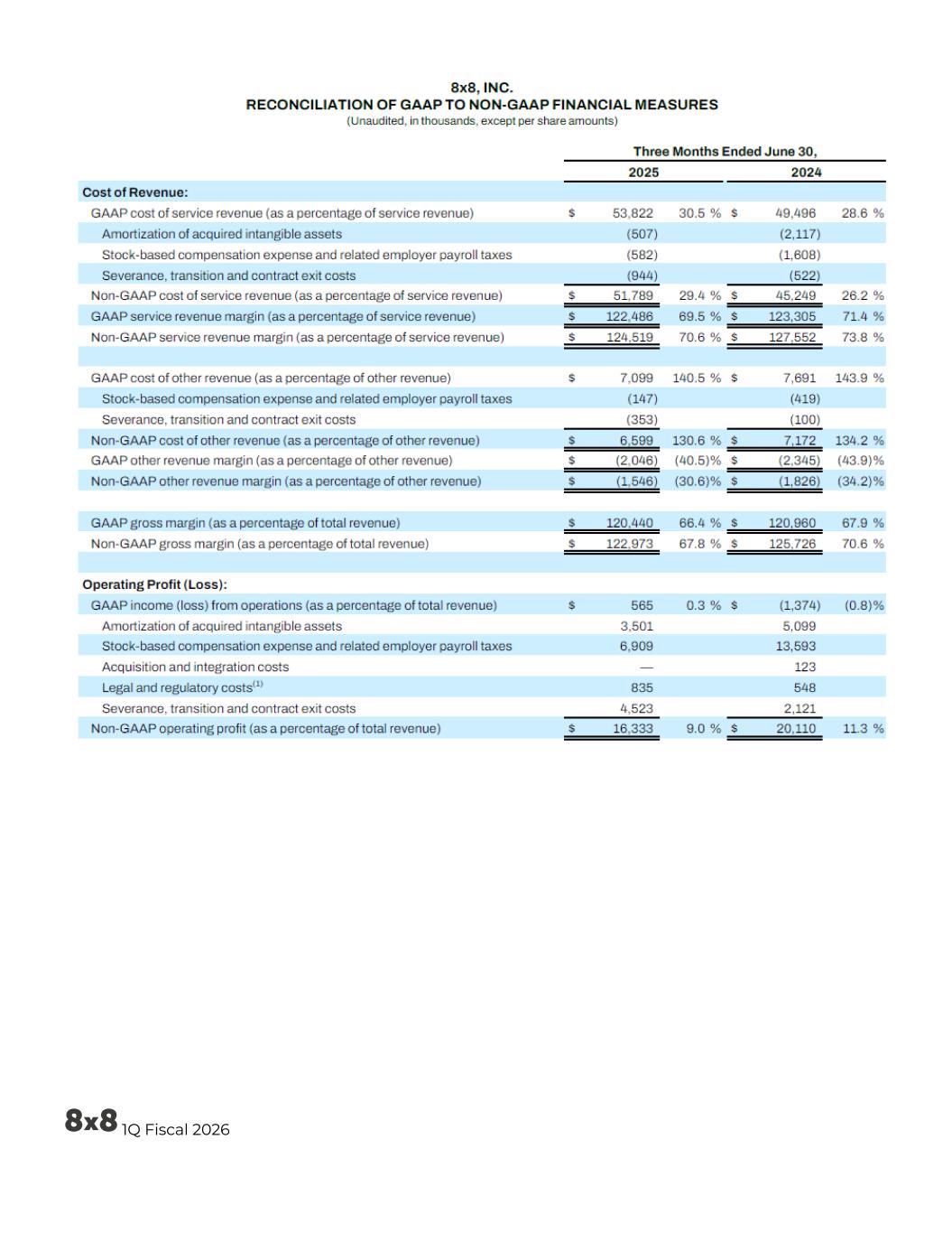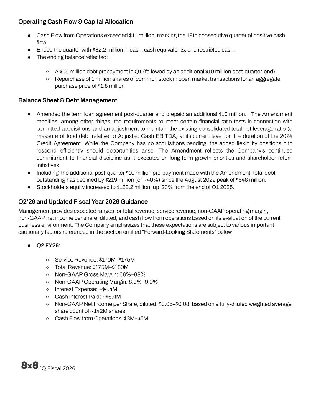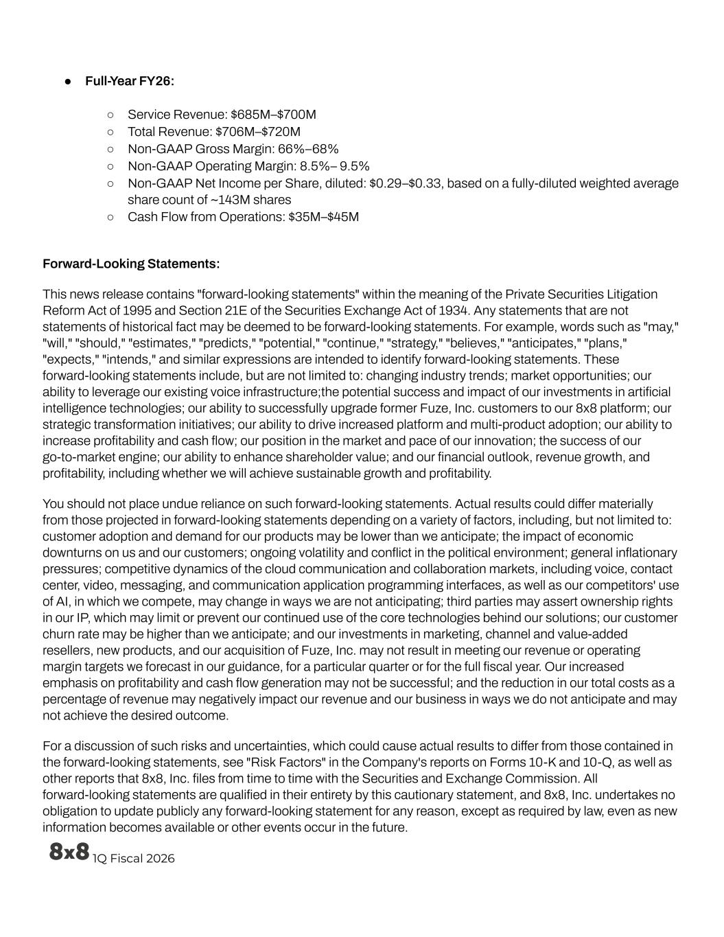 ● Full-Year FY26: ○ Service Revenue: $685M–$700M ○ Total Revenue: $706M–$720M ○ Non-GAAP Gross Margin: 66%–68% ○ Non-GAAP Operating Margin: 8.5%– 9.5% ○ Non-GAAP Net Income per Share, diluted: $0.29–$0.33, based on a fully-diluted weighted average share count of ~143M shares ○ Cash Flow from Operations: $35M–$45M Forward-Looking Statements: This news release contains "forward-looking statements" within the meaning of the Private Securities Litigation Reform Act of 1995 and Section 21E of the Securities Exchange Act of 1934. Any statements that are not statements of historical fact may be deemed to be forward-looking statements. For example, words such as "may," "will," "should," "estimates," "predicts," "potential," "continue," "strategy," "believes," "anticipates," "plans," "expects," "intends," and similar expressions are intended to identify forward-looking statements. These forward-looking statements include, but are not limited to: changing industry trends; market opportunities; our ability to leverage our existing voice infrastructure;the potential success and impact of our investments in artificial intelligence technologies; our ability to successfully upgrade former Fuze, Inc. customers to our 8x8 platform; our strategic transformation initiatives; our ability to drive increased platform and multi-product adoption; our ability to increase profitability and cash flow; our position in the market and pace of our innovation; the success of our go-to-market engine; our ability to enhance shareholder value; and our financial outlook, revenue growth, and profitability, including whether we will achieve sustainable growth and profitability. You should not place undue reliance on such forward-looking statements. Actual results could differ materially from those projected in forward-looking statements depending on a variety of factors, including, but not limited to: customer adoption and demand for our products may be lower than we anticipate; the impact of economic downturns on us and our customers; ongoing volatility and conflict in the political environment; general inflationary pressures; competitive dynamics of the cloud communication and collaboration markets, including voice, contact center, video, messaging, and communication application programming interfaces, as well as our competitors' use of AI, in which we compete, may change in ways we are not anticipating; third parties may assert ownership rights in our IP, which may limit or prevent our continued use of the core technologies behind our solutions; our customer churn rate may be higher than we anticipate; and our investments in marketing, channel and value-added resellers, new products, and our acquisition of Fuze, Inc. may not result in meeting our revenue or operating margin targets we forecast in our guidance, for a particular quarter or for the full fiscal year. Our increased emphasis on profitability and cash flow generation may not be successful; and the reduction in our total costs as a percentage of revenue may negatively impact our revenue and our business in ways we do not anticipate and may not achieve the desired outcome. For a discussion of such risks and uncertainties, which could cause actual results to differ from those contained in the forward-looking statements, see "Risk Factors" in the Company's reports on Forms 10-K and 10-Q, as well as other reports that 8x8, Inc. files from time to time with the Securities and Exchange Commission. All forward-looking statements are qualified in their entirety by this cautionary statement, and 8x8, Inc. undertakes no obligation to update publicly any forward-looking statement for any reason, except as required by law, even as new information becomes available or other events occur in the future. 1Q Fiscal 2026