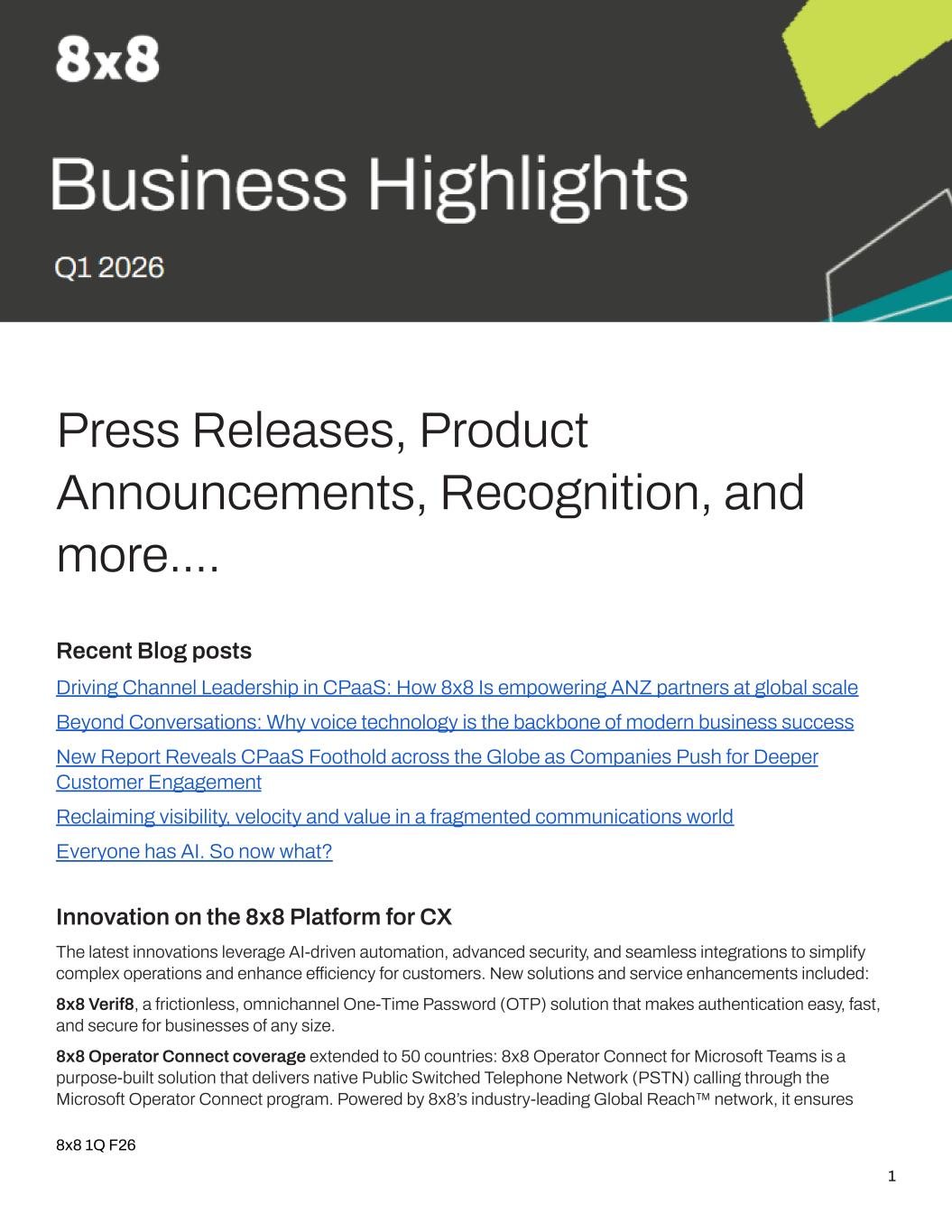 Press Releases, Product Announcements, Recognition, and more…. Recent Blog posts Driving Channel Leadership in CPaaS: How 8x8 Is empowering ANZ partners at global scale Beyond Conversations: Why voice technology is the backbone of modern business success New Report Reveals CPaaS Foothold across the Globe as Companies Push for Deeper Customer Engagement Reclaiming visibility, velocity and value in a fragmented communications world Everyone has AI. So now what? Innovation on the 8x8 Platform for CX The latest innovations leverage AI-driven automation, advanced security, and seamless integrations to simplify complex operations and enhance efficiency for customers. New solutions and service enhancements included: 8x8 Verif8, a frictionless, omnichannel One-Time Password (OTP) solution that makes authentication easy, fast, and secure for businesses of any size. 8x8 Operator Connect coverage extended to 50 countries: 8x8 Operator Connect for Microsoft Teams is a purpose-built solution that delivers native Public Switched Telephone Network (PSTN) calling through the Microsoft Operator Connect program. Powered by 8x8’s industry-leading Global Reach™ network, it ensures 8x8 1Q F26 1