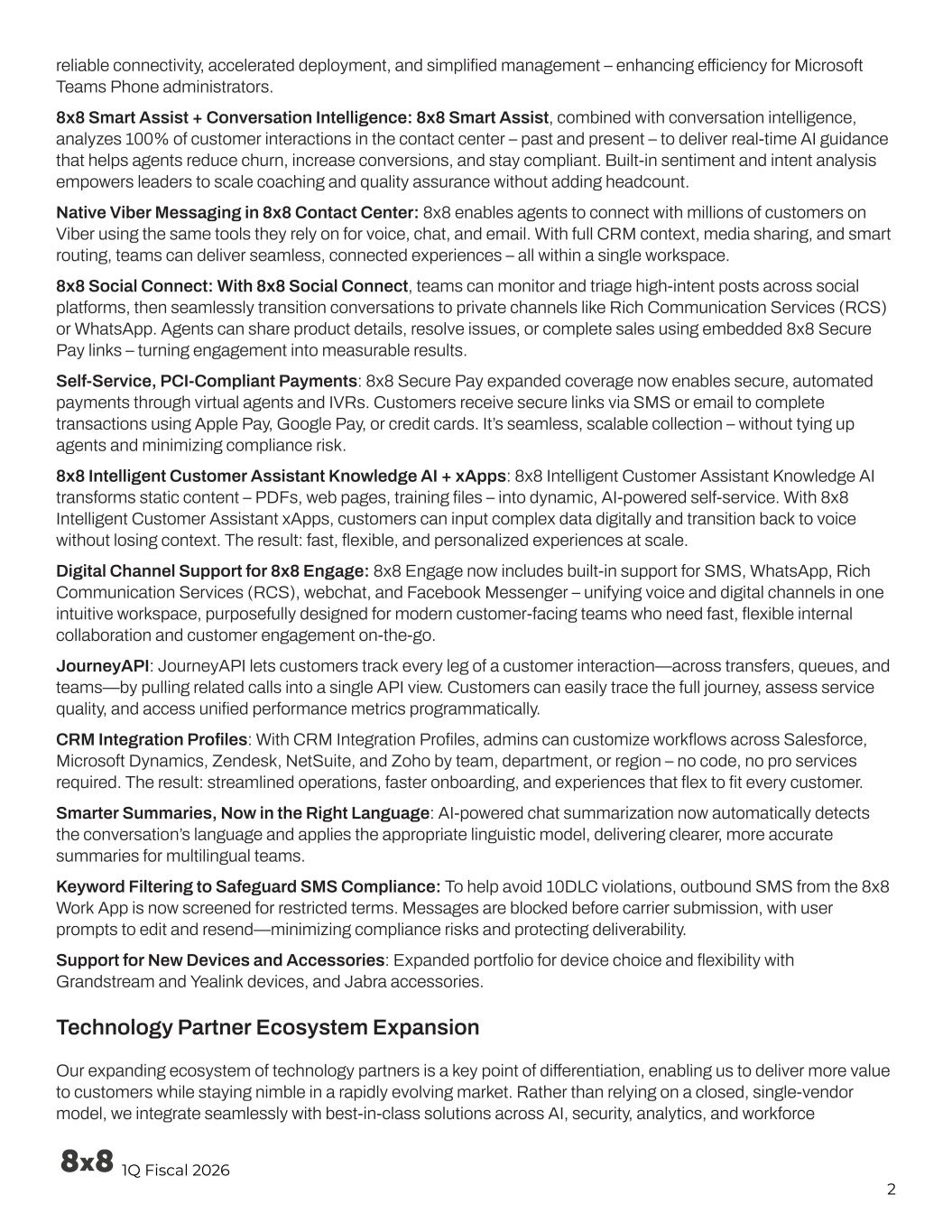 reliable connectivity, accelerated deployment, and simplified management – enhancing efficiency for Microsoft Teams Phone administrators. 8x8 Smart Assist + Conversation Intelligence: 8x8 Smart Assist, combined with conversation intelligence, analyzes 100% of customer interactions in the contact center – past and present – to deliver real-time AI guidance that helps agents reduce churn, increase conversions, and stay compliant. Built-in sentiment and intent analysis empowers leaders to scale coaching and quality assurance without adding headcount. Native Viber Messaging in 8x8 Contact Center: 8x8 enables agents to connect with millions of customers on Viber using the same tools they rely on for voice, chat, and email. With full CRM context, media sharing, and smart routing, teams can deliver seamless, connected experiences – all within a single workspace. 8x8 Social Connect: With 8x8 Social Connect, teams can monitor and triage high-intent posts across social platforms, then seamlessly transition conversations to private channels like Rich Communication Services (RCS) or WhatsApp. Agents can share product details, resolve issues, or complete sales using embedded 8x8 Secure Pay links – turning engagement into measurable results. Self-Service, PCI-Compliant Payments: 8x8 Secure Pay expanded coverage now enables secure, automated payments through virtual agents and IVRs. Customers receive secure links via SMS or email to complete transactions using Apple Pay, Google Pay, or credit cards. It’s seamless, scalable collection – without tying up agents and minimizing compliance risk. 8x8 Intelligent Customer Assistant Knowledge AI + xApps: 8x8 Intelligent Customer Assistant Knowledge AI transforms static content – PDFs, web pages, training files – into dynamic, AI-powered self-service. With 8x8 Intelligent Customer Assistant xApps, customers can input complex data digitally and transition back to voice without losing context. The result: fast, flexible, and personalized experiences at scale. Digital Channel Support for 8x8 Engage: 8x8 Engage now includes built-in support for SMS, WhatsApp, Rich Communication Services (RCS), webchat, and Facebook Messenger – unifying voice and digital channels in one intuitive workspace, purposefully designed for modern customer-facing teams who need fast, flexible internal collaboration and customer engagement on-the-go. JourneyAPI: JourneyAPI lets customers track every leg of a customer interaction—across transfers, queues, and teams—by pulling related calls into a single API view. Customers can easily trace the full journey, assess service quality, and access unified performance metrics programmatically. CRM Integration Profiles: With CRM Integration Profiles, admins can customize workflows across Salesforce, Microsoft Dynamics, Zendesk, NetSuite, and Zoho by team, department, or region – no code, no pro services required. The result: streamlined operations, faster onboarding, and experiences that flex to fit every customer. Smarter Summaries, Now in the Right Language: AI-powered chat summarization now automatically detects the conversation’s language and applies the appropriate linguistic model, delivering clearer, more accurate summaries for multilingual teams. Keyword Filtering to Safeguard SMS Compliance: To help avoid 10DLC violations, outbound SMS from the 8x8 Work App is now screened for restricted terms. Messages are blocked before carrier submission, with user prompts to edit and resend—minimizing compliance risks and protecting deliverability. Support for New Devices and Accessories: Expanded portfolio for device choice and flexibility with Grandstream and Yealink devices, and Jabra accessories. Technology Partner Ecosystem Expansion Our expanding ecosystem of technology partners is a key point of differentiation, enabling us to deliver more value to customers while staying nimble in a rapidly evolving market. Rather than relying on a closed, single-vendor model, we integrate seamlessly with best-in-class solutions across AI, security, analytics, and workforce 1Q Fiscal 2026 2