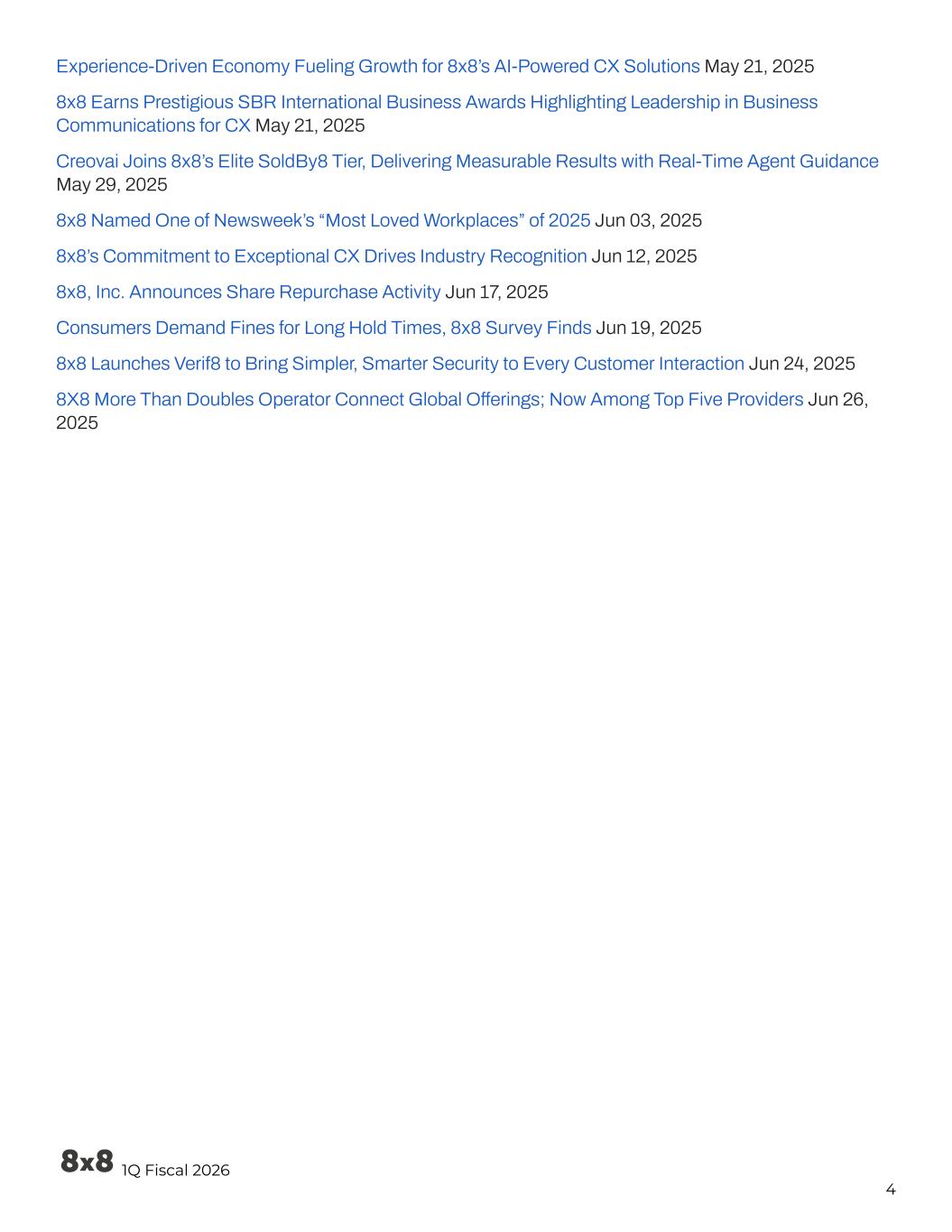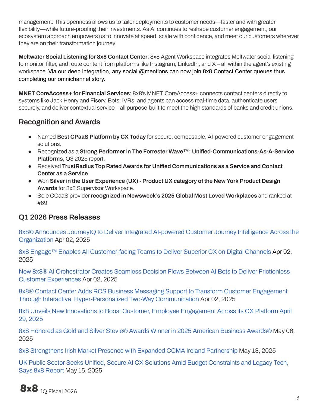 management. This openness allows us to tailor deployments to customer needs—faster and with greater flexibility—while future-proofing their investments. As AI continues to reshape customer engagement, our ecosystem approach empowers us to innovate at speed, scale with confidence, and meet our customers wherever they are on their transformation journey. Meltwater Social Listening for 8x8 Contact Center: 8x8 Agent Workspace integrates Meltwater social listening to monitor, filter, and route content from platforms like Instagram, LinkedIn, and X – all within the agent’s existing workspace. Via our deep integration, any social @mentions can now join 8x8 Contact Center queues thus completing our omnichannel story. MNET CoreAccess+ for Financial Services: 8x8’s MNET CoreAccess+ connects contact centers directly to systems like Jack Henry and Fiserv. Bots, IVRs, and agents can access real-time data, authenticate users securely, and deliver contextual service – all purpose-built to meet the high standards of banks and credit unions. Recognition and Awards ● Named Best CPaaS Platform by CX Today for secure, composable, AI-powered customer engagement solutions. ● Recognized as a Strong Performer in The Forrester Wave™: Unified-Communications-As-A-Service Platforms, Q3 2025 report. ● Received TrustRadius Top Rated Awards for Unified Communications as a Service and Contact Center as a Service. ● Won Silver in the User Experience (UX) - Product UX category of the New York Product Design Awards for 8x8 Supervisor Workspace. ● Sole CCaaS provider recognized in Newsweek’s 2025 Global Most Loved Workplaces and ranked at #69. Q1 2026 Press Releases 8x8® Announces JourneyIQ to Deliver Integrated AI-powered Customer Journey Intelligence Across the Organization Apr 02, 2025 8x8 Engage™ Enables All Customer-facing Teams to Deliver Superior CX on Digital Channels Apr 02, 2025 New 8x8® AI Orchestrator Creates Seamless Decision Flows Between AI Bots to Deliver Frictionless Customer Experiences Apr 02, 2025 8x8® Contact Center Adds RCS Business Messaging Support to Transform Customer Engagement Through Interactive, Hyper-Personalized Two-Way Communication Apr 02, 2025 8x8 Unveils New Innovations to Boost Customer, Employee Engagement Across its CX Platform April 29, 2025 8x8 Honored as Gold and Silver Stevie® Awards Winner in 2025 American Business Awards® May 06, 2025 8x8 Strengthens Irish Market Presence with Expanded CCMA Ireland Partnership May 13, 2025 UK Public Sector Seeks Unified, Secure AI CX Solutions Amid Budget Constraints and Legacy Tech, Says 8x8 Report May 15, 2025 1Q Fiscal 2026 3